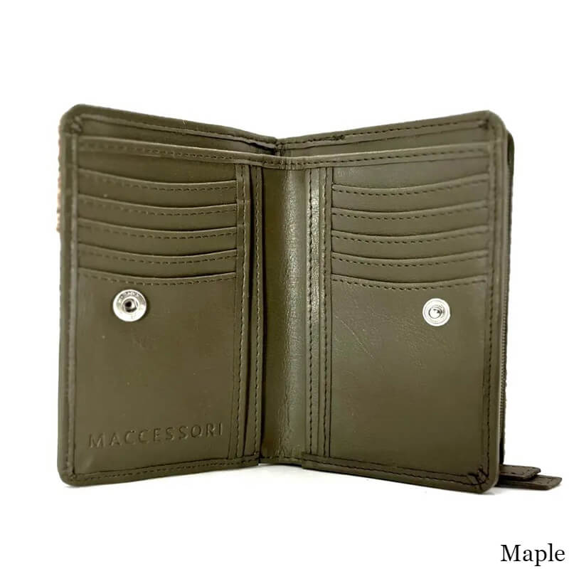 Measuring 5.51 inches wide, 3.54 inches high, and 1.18 inches deep, this wallet has a zip compartment, an internal wallet compartment for notes, 11 credit card slots, and 4 open compartments for receipts or notes.