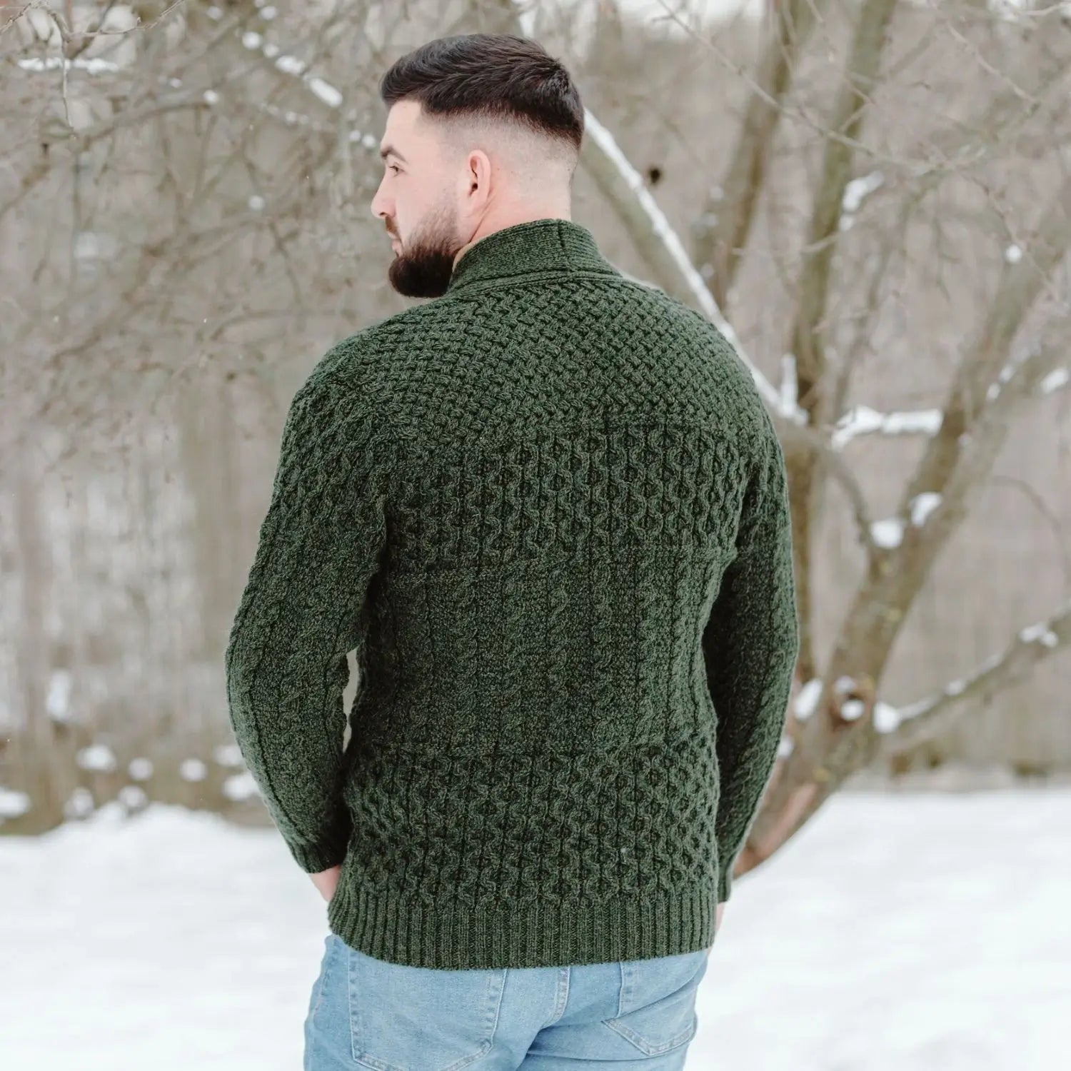 Knit in Ireland of 100% Merino Wool – Our Men's Aran Shawl Neck Merino Cardigan, Green is soft, highly breathable, moisture-wicking, durable, and warm, all while being machine washable