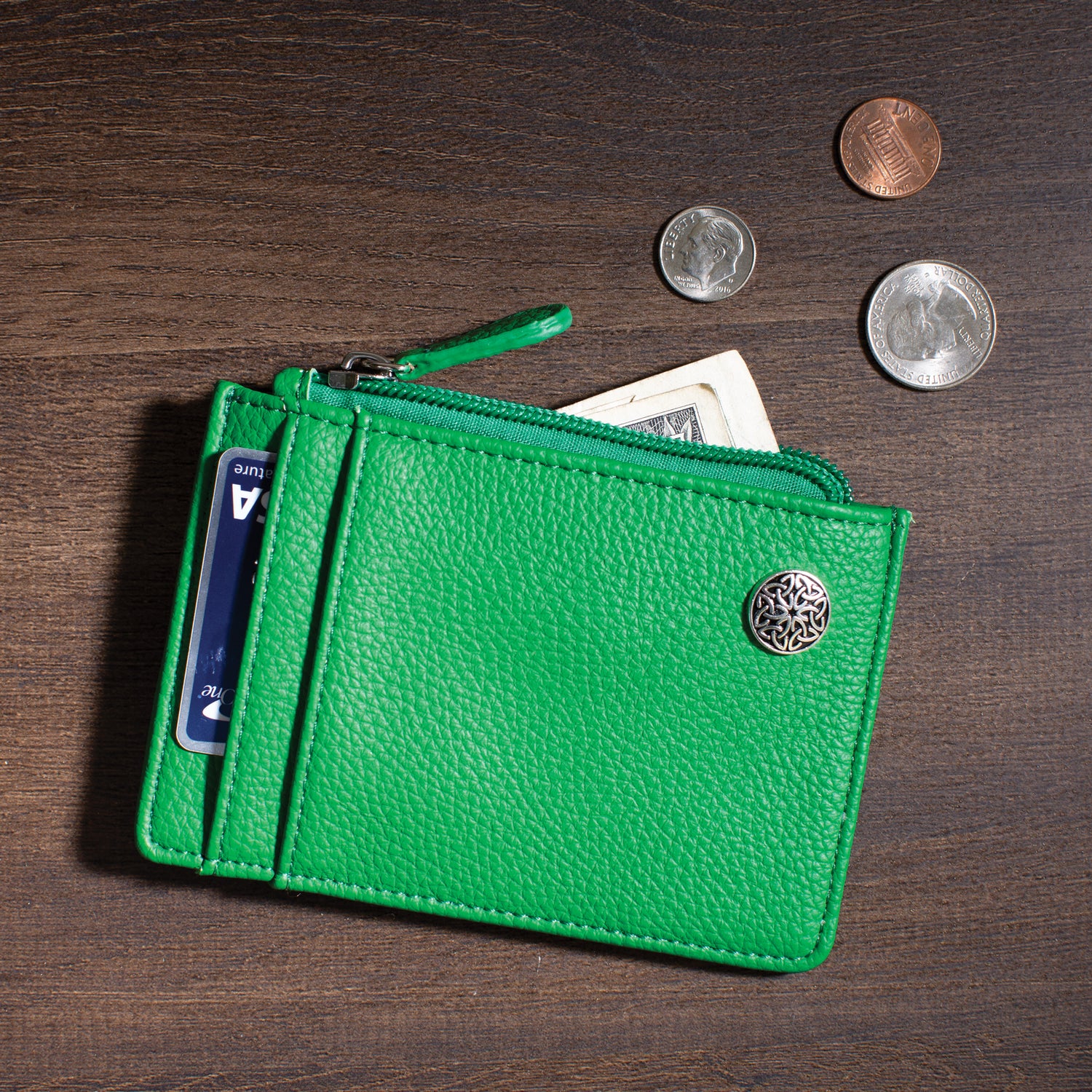 This CIG exclusive vegan leather ID Holder is embellished with a Celtic button and perfect for anyone on the go. ID holder features include RFID Blocking Technology, a top zipper for cash and other keepsakes, an exterior featuring three pockets for credit cards, and one windowed pocket for an ID. The Trinity knot button on the front gives an elegant Irish flair. 3½" W x 5" H.