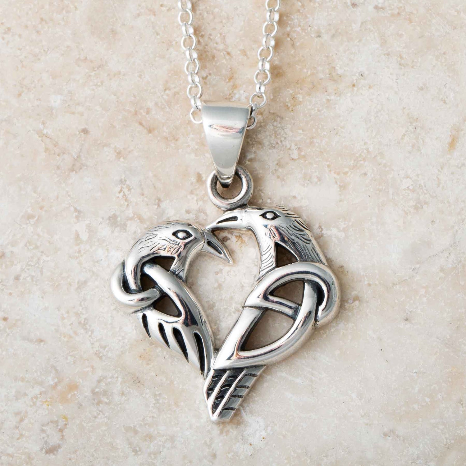 The pendant is shaped in a heart form and designed with raven motifs. The Mythical Raven is a significant symbol in Celtic culture, representing the messenger between life and death. An ancient symbol, the Raven is thought to symbolize protection and healing.