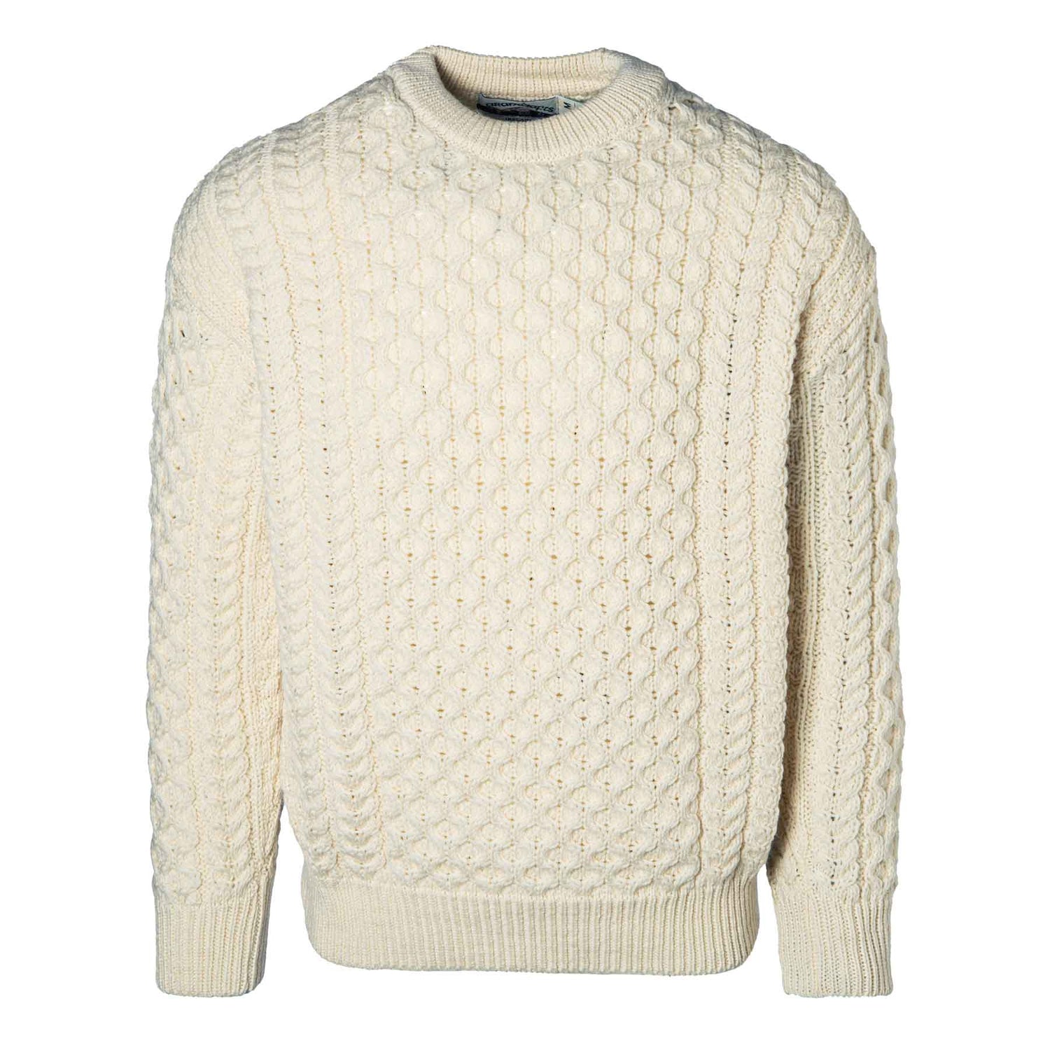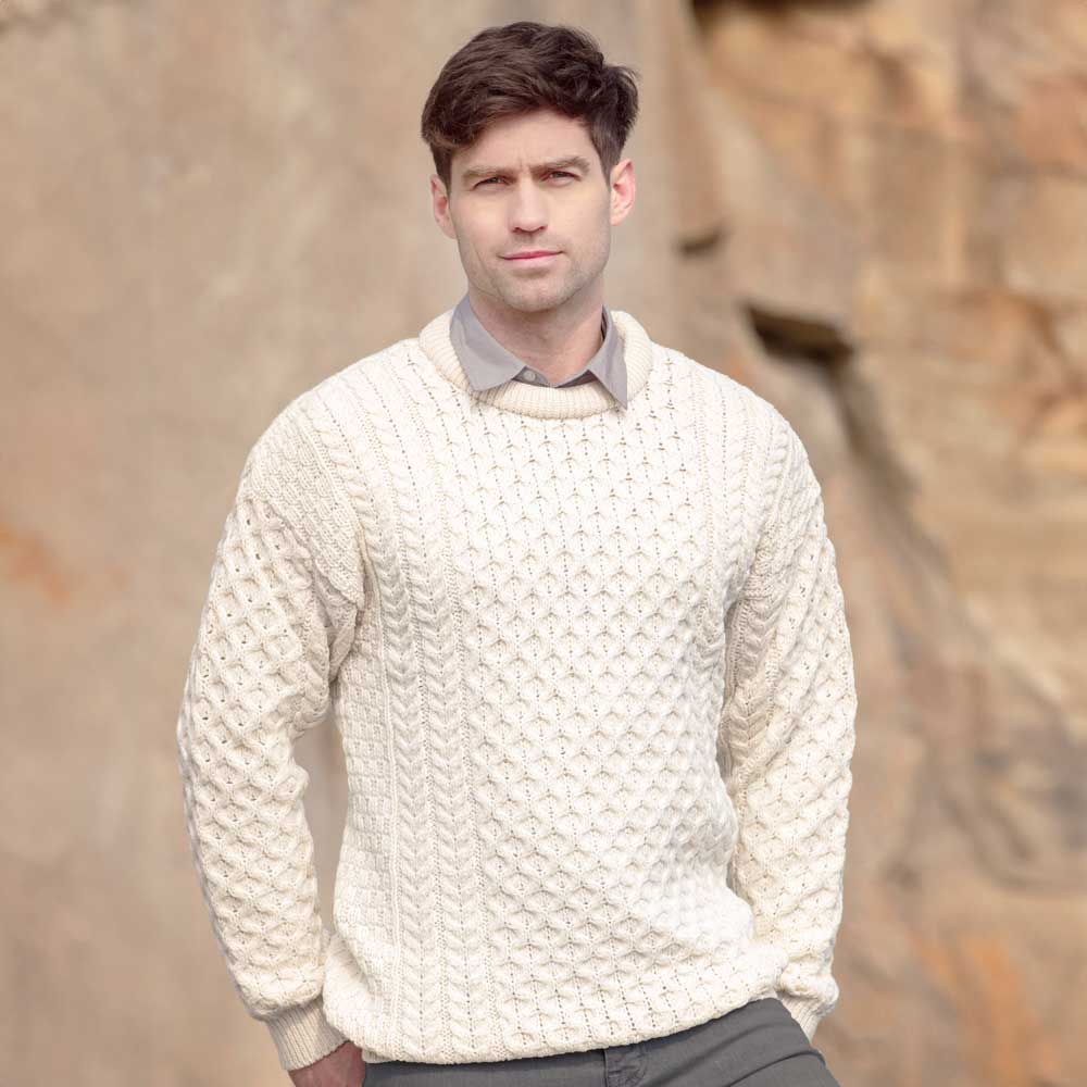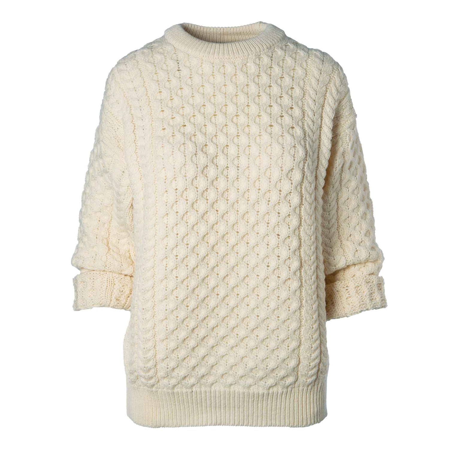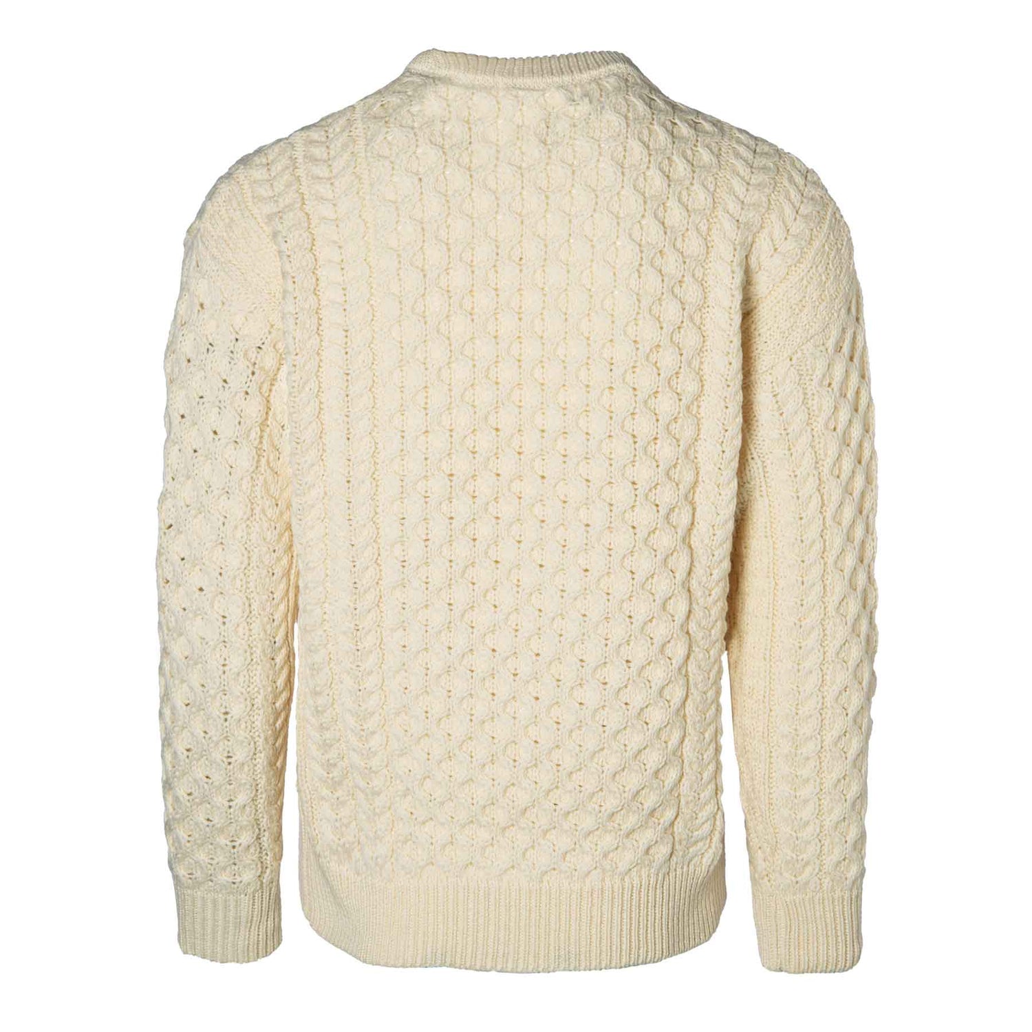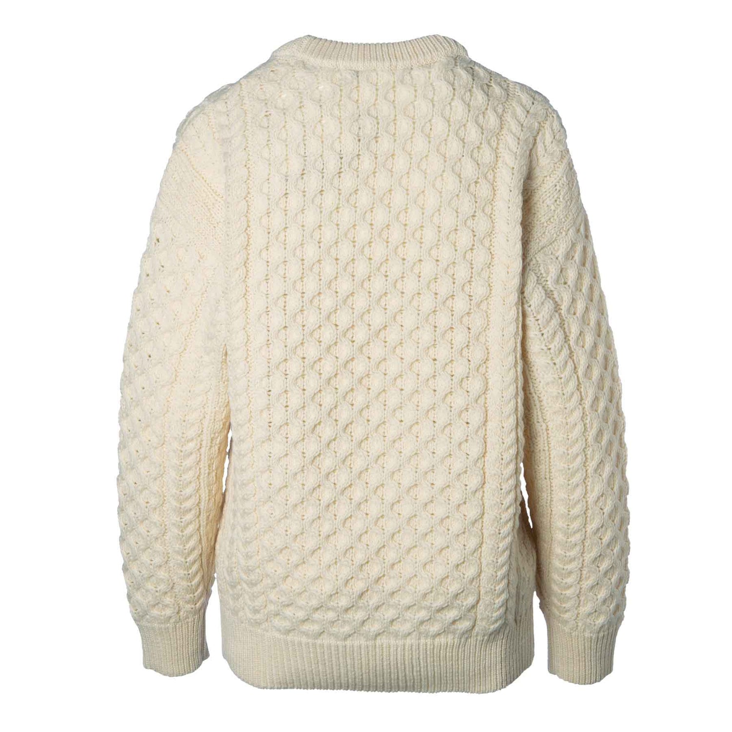 This Traditional Irish crew neck sweater is one of Aran Crafts greatest sellers. It follows all the Traditional Irish Aran stitching patterns that have been passed down from generation to generation, which in olden days told stories of families and life in Ireland. Along the center panel of the body the honeycomb Aran stitch flows, signifying the hard working bee or the hard work of a fisherman. On either side of this center paneling there are rows of Irish cable Aran stitches resembling the fisherman's ropes, the link to life. Can be worn by men and women. 100% Merino Wool. Made in Ireland.