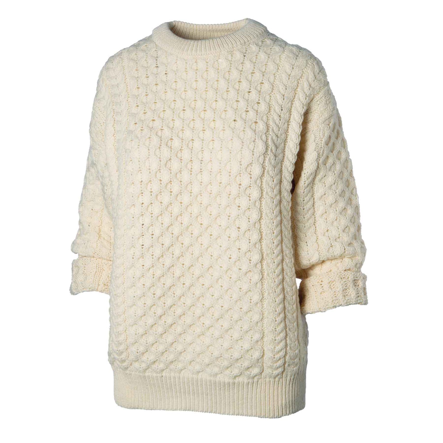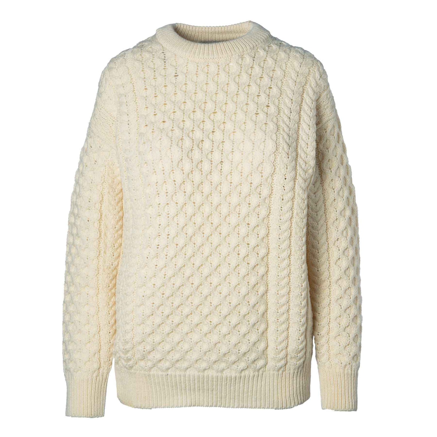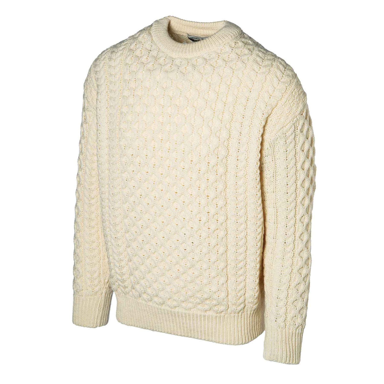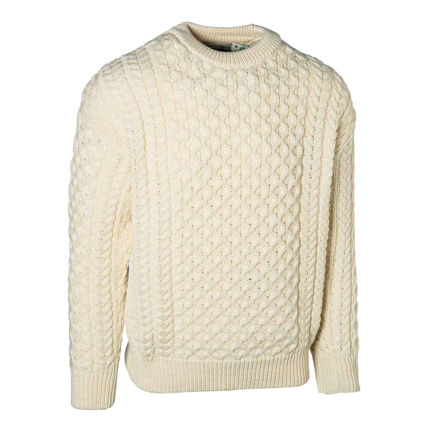This Traditional Irish crew neck sweater is one of Aran Crafts greatest sellers. It follows all the Traditional Irish Aran stitching patterns that have been passed down from generation to generation, which in olden days told stories of families and life in Ireland. Along the center panel of the body the honeycomb Aran stitch flows, signifying the hard working bee or the hard work of a fisherman. On either side of this center paneling there are rows of Irish cable Aran stitches resembling the fisherman's ropes, the link to life. Can be worn by men and women. 100% Merino Wool. Made in Ireland.