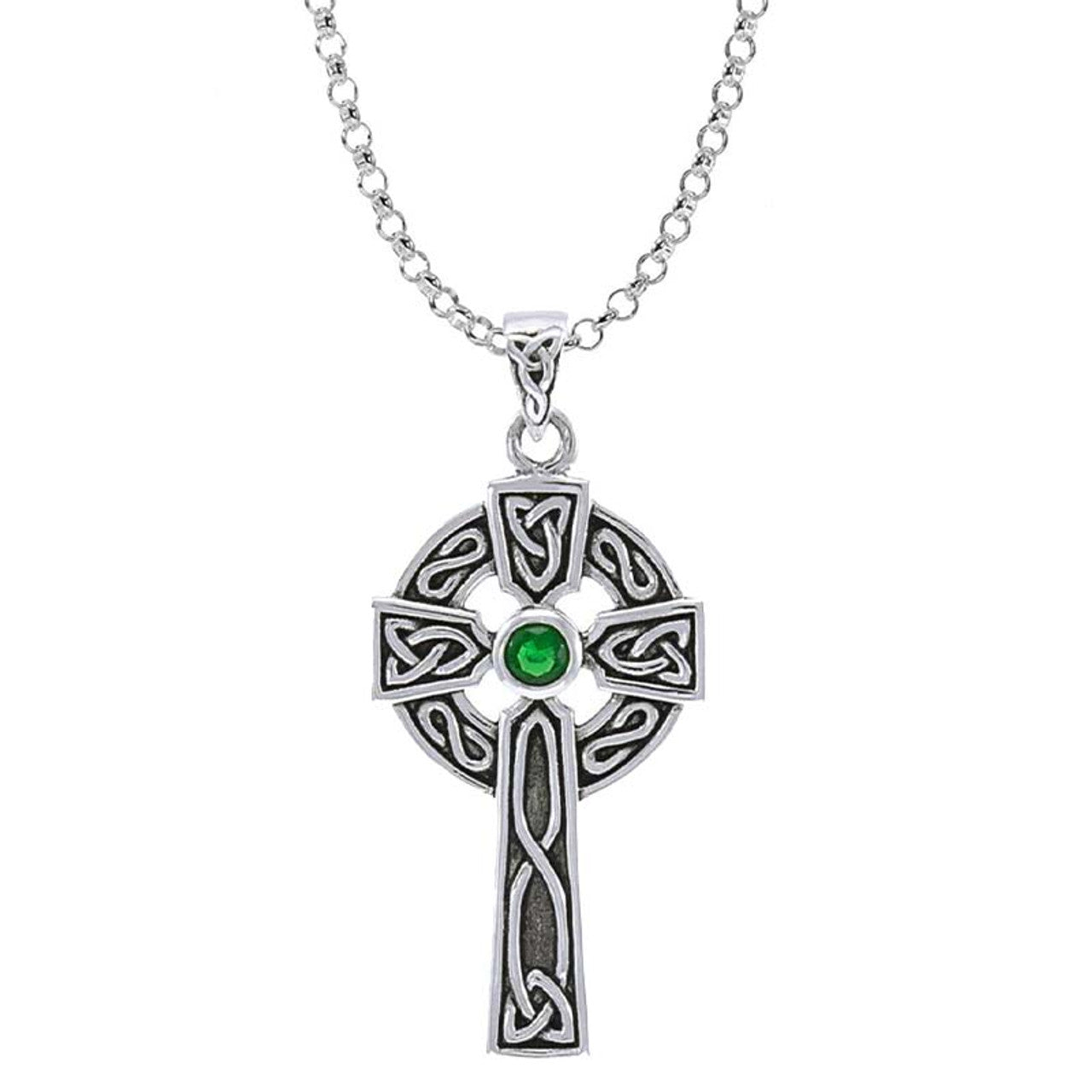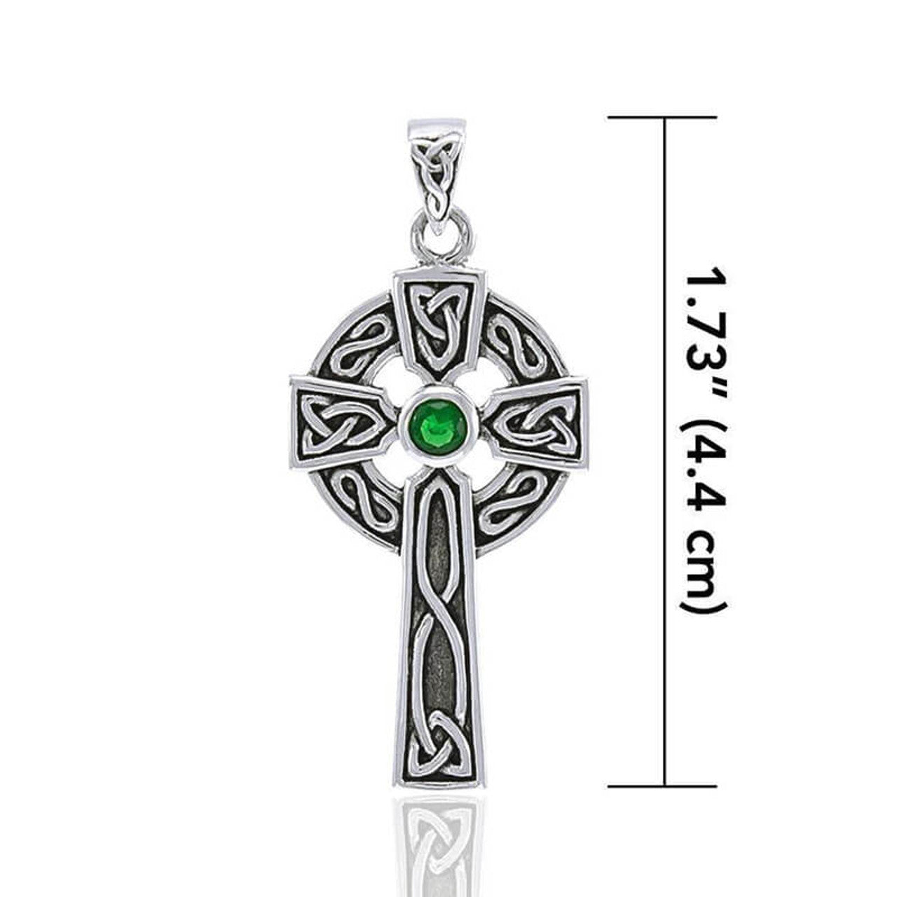 Our Celtic Cross Silver Pendant with Green Gemstone is a richly detailed accessory inspired by Irish faith and tradition. Shaped as a classic Celtic High Cross, it reflects one of Ireland’s most enduring religious symbols. The defining inner circle represents continuity and eternity, while a delicate emerald-colored glass stone at the center adds a subtle touch of color and visual depth to the design.