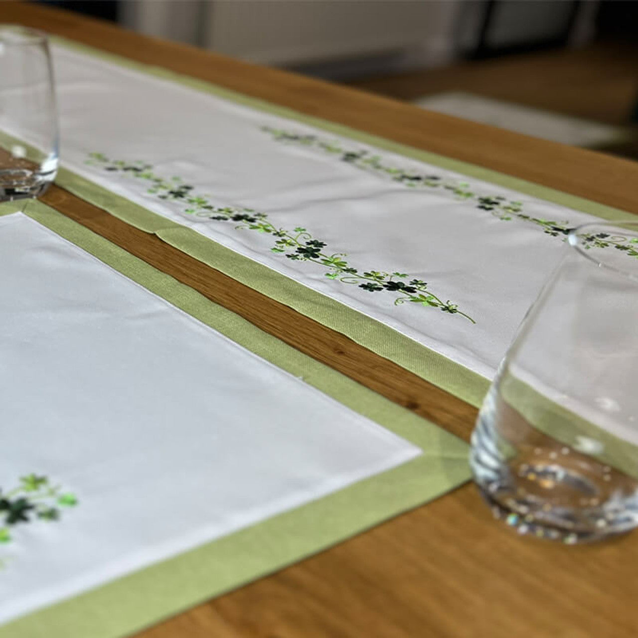 Elevate your dining experience with our Irish Linen Embroidered Shamrock Table Runner, a perfect blend of practicality and Irish charm. This table runner is adorned with embroidered green shamrocks, adding a sense of authenticity to your kitchen. Each shamrock adds a touch of Irish charm and tradition to your table setting.