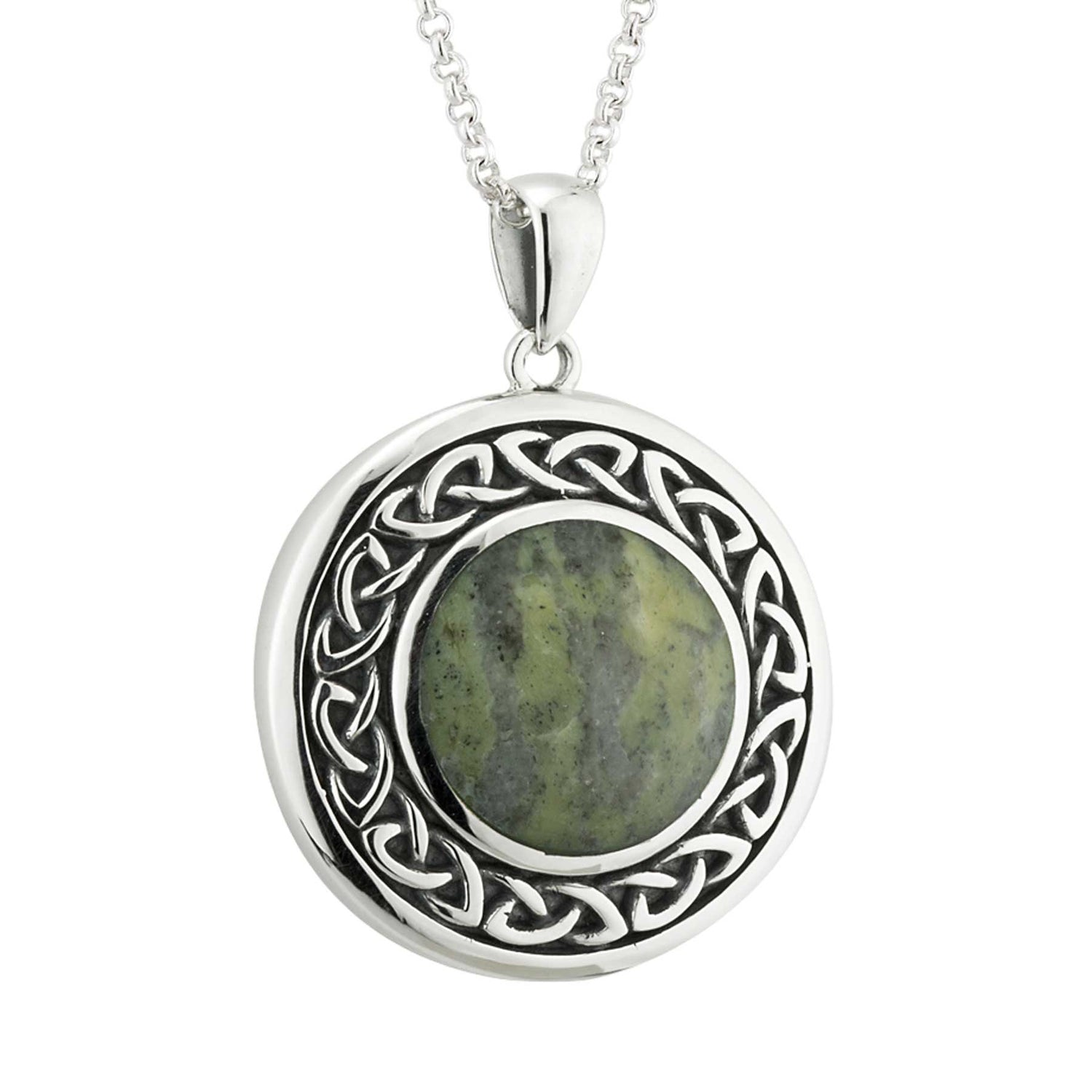 Discover the timeless elegance of Ireland with our Connemara Marble Celtic Knot Necklace. Crafted from the unique Connemara marble, known as “Ireland’s gemstone,” this beautiful round pendant echoes the rich history and natural beauty of the Irish landscape. Sourced from the Joyce family mine in Connemara, County Galway, each piece of marble is truly authentic, ensuring your jewelry is one-of-a-kind. Encircled by intricate Celtic knot-work in sterling silver, this pendant celebrates Ireland's ancient artistry and symbolism. Measuring .87" in diameter and presented on a 20" sterling silver belcher chain, it has been officially Irish hallmarked in Dublin Castle, certifying its authenticity. Made in Ireland, this necklace is a stunning representation of Irish heritage and craftsmanship.