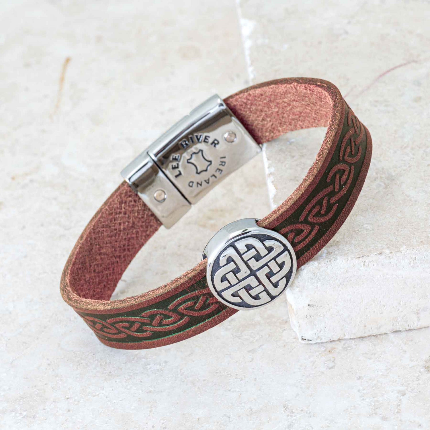 Introducing the Celtic Knot Bracelet, the perfect way to express your timeless connection to Celtic art and culture. This stunning bracelet features a brown embossed leather band adorned with traditional Celtic knotwork for a unique and eye-catching design. The centerpiece of this bracelet is a beautiful stainless-steel medallion accented with its classic Celtic knot design. Additionally, a stainless-steel clasp provides extra security so you can depend on your bracelet to stay in place. As versatile as it is stylish, this piece brings added sophistication to any formal or casual ensemble while honoring centuries-old traditions. Add the perfect finishing touch to your wardrobe by purchasing our Celtic Knot Bracelet today!