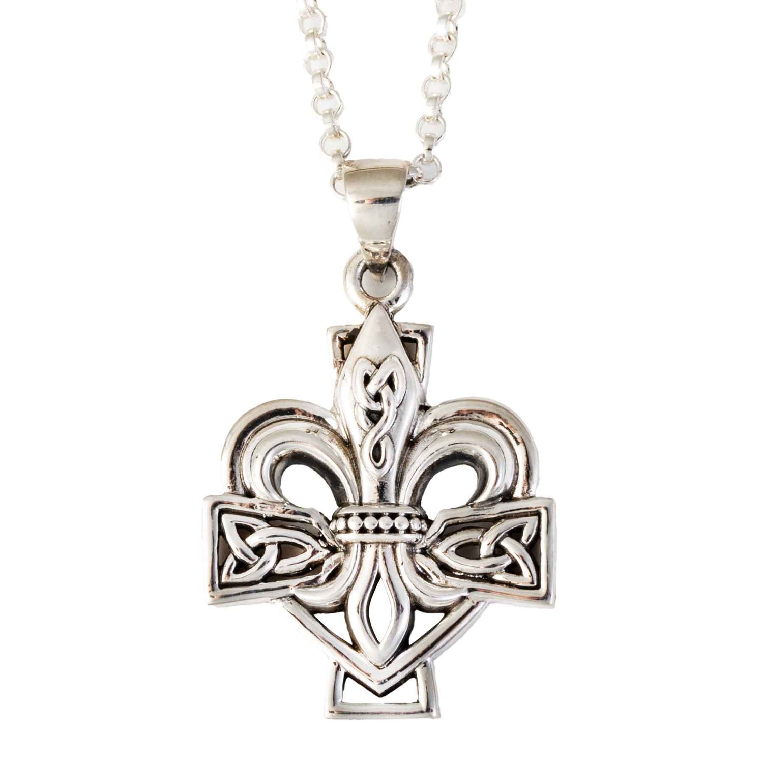 Elevate your accessory game with the exquisite Celtic Cross Fleur de Lis Necklace. This handcrafted masterpiece merges the timeless elegance of the Fleur de Lis with the spiritual symbolism of the Celtic Cross, creating a unique piece that speaks volumes of faith and heritage. Made from premium 925 Sterling Silver, it boasts durability and a radiant shine that complements any outfit. The necklace features intricate Celtic knotwork, highlighting the rich Celtic culture and adding an element of mystique. Measuring 0.9” W x 1” H, it strikes the perfect balance between statement and subtlety, suitable for daily wear or special occasions. Accompanied by a complimentary chain and presented in a gift box, it's an ideal gift that marries elegance with deep spiritual symbolism.