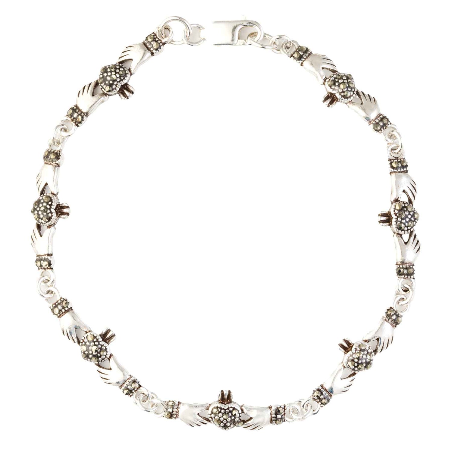 Embrace the essence of Irish tradition with our Sterling Silver Irish Claddagh Bracelet. Expertly crafted from sterling silver for lasting durability and a high shine, this bracelet is beautifully accented with marcasite, adding an extra layer of sophistication. The bracelet features the iconic Claddagh Ring design, a poignant symbol of love, friendship, and loyalty that tells the story of an Irish seafarer's tribute to his lost love. With a secure clasp closure, the bracelet measures 0.75” by 0.23”, ensuring a comfortable fit for daily wear. Presented in an elegant box, it makes a unique and meaningful gift that captures the heart of Irish culture.