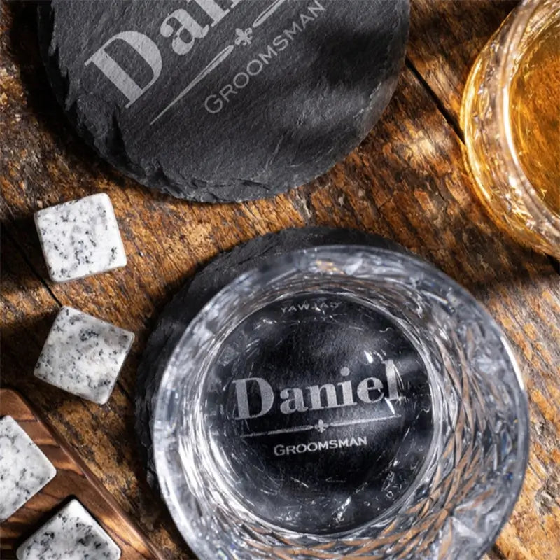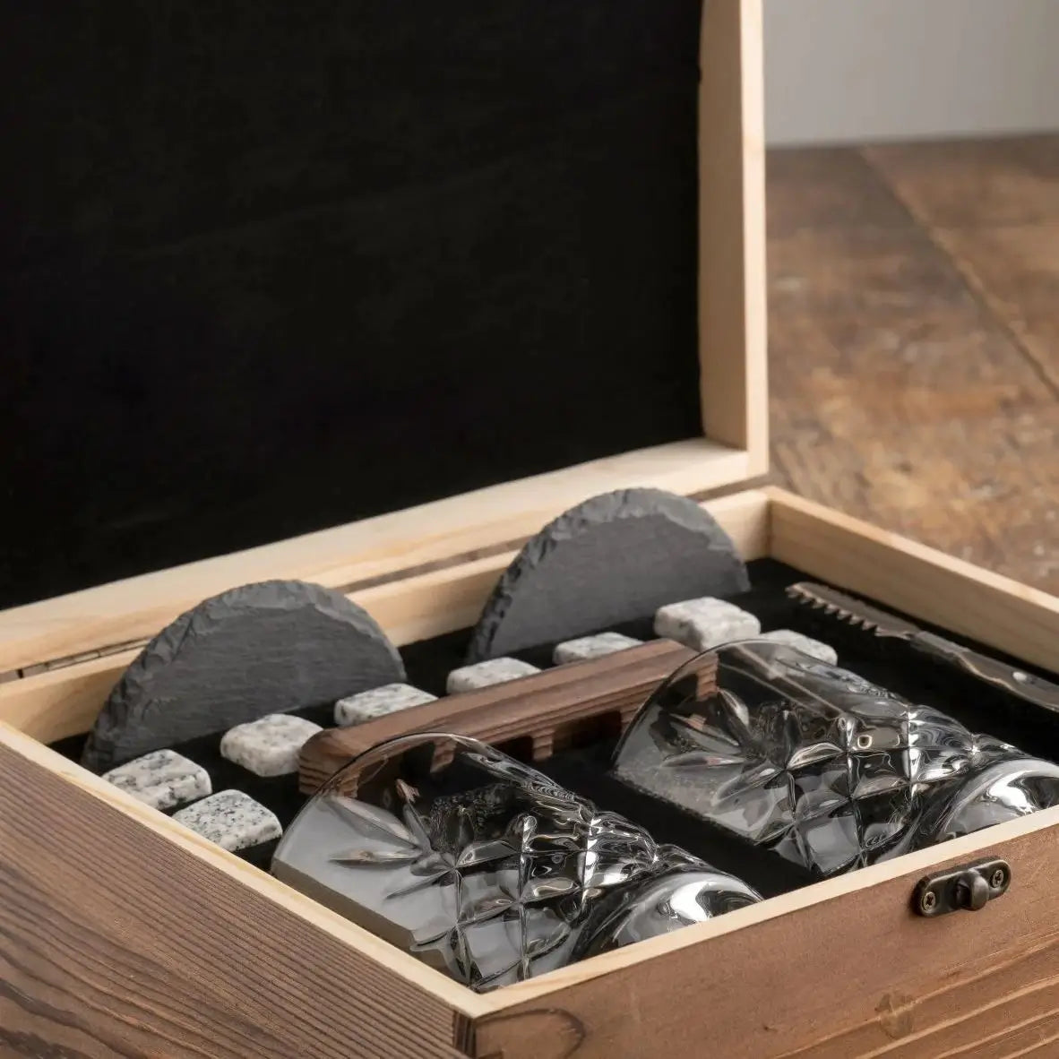 Elevate your whiskey experience with the Galway Renmore Whiskey Set. This beautifully crafted wooden boxed barware set is the ultimate gift for whiskey enthusiasts, designed to make every whiskey lover feel like the epitome of sophistication. With our stunning set, they will have everything they need to enhance and savor the flavor of their whiskey. The set includes 2 whiskey glasses, 8 granite cooling stones with a wooden stone holder, stainless steel tongs, and a set of 2 slate coasters. The wooden box measures 8.27" L x 10.2" W x 4.7" H, making it a perfect addition to any home bar or a delightful gift for any occasion.