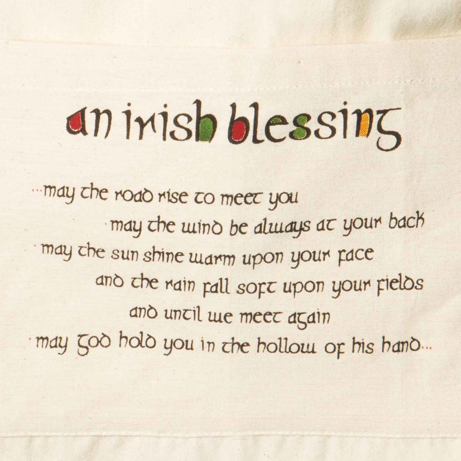Our "May The Road Rise To Meet You" Kitchen Apron brings an Irish blessing into your kitchen. Crafted from 100% cotton, the apron features a spacious front pocket where the Irish blessing is beautifully scripted. At 31½ " L x 23" W, it provides ample coverage while you cook. Adorned with elegant Celtic knotwork, it's the perfect gift for lovers of Irish culture.