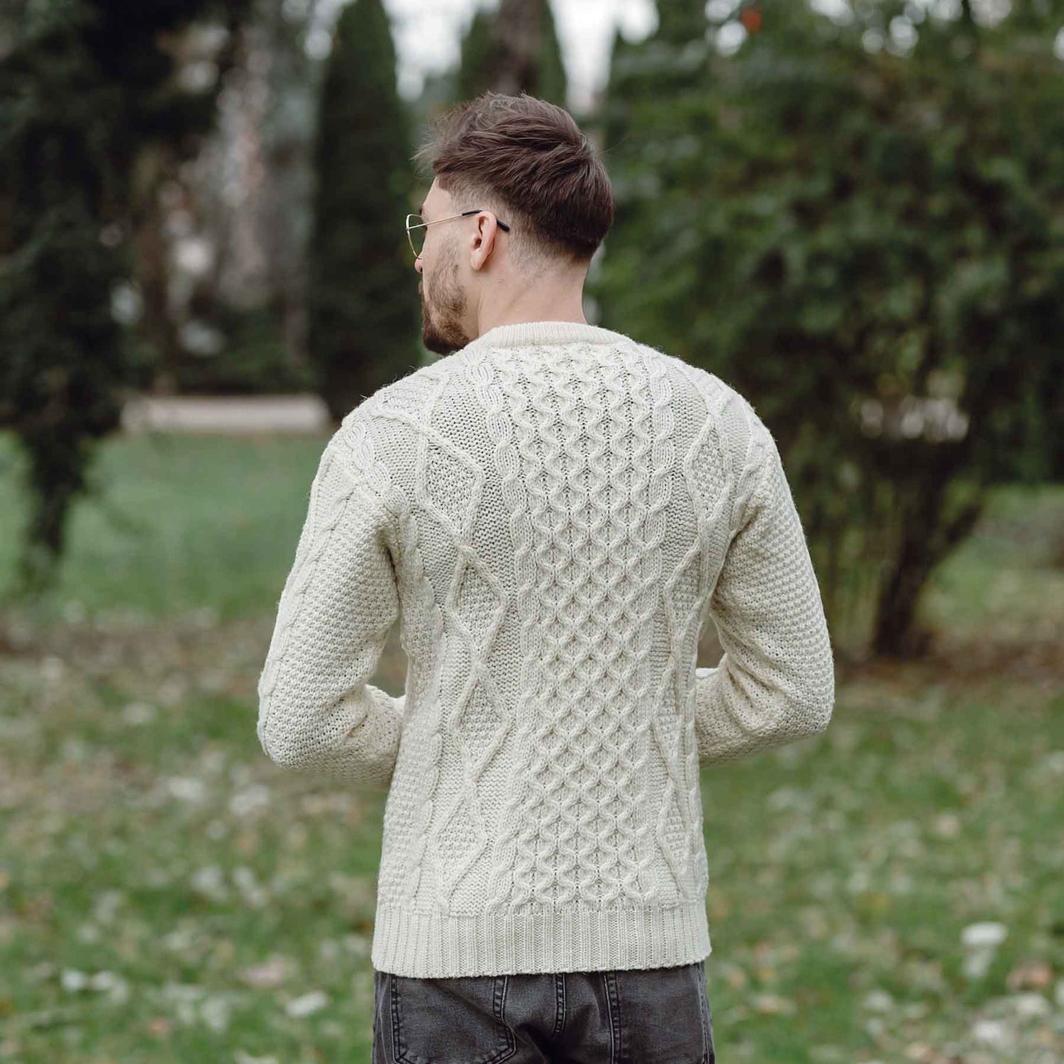 This sweater features an array of stitches – cable, diamond, honeycomb, and moss – all linked by hand in Ireland, representing wishes for the wearer's good luck & safety