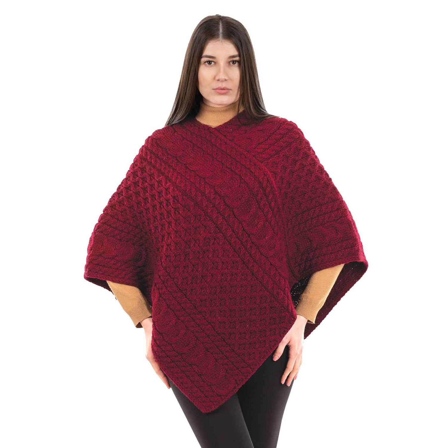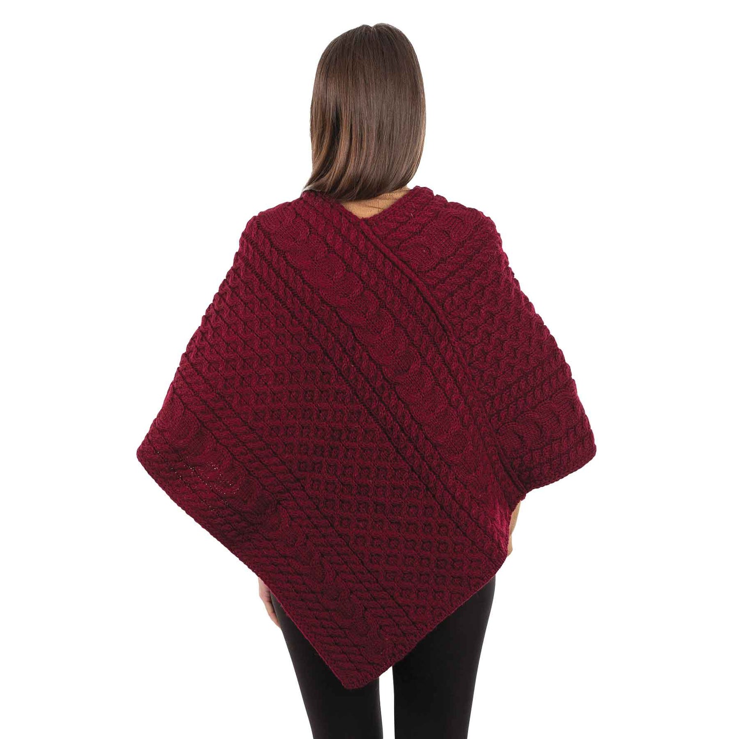 Women's Merino Wool Aran Triangular Poncho, Wine