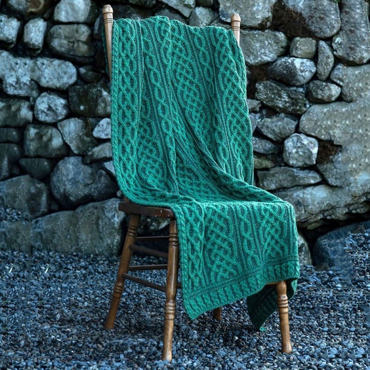 Wrap yourself in the warmth and comfort of our Aran Knit Throw Blanket with Lace Trim in a vibrant green. Handcrafted in Ireland, it features traditional Honeycomb and Cable patterns symbolizing hard work and protection. Made from 100% Supersoft Merino wool, this blanket offers unparalleled comfort. The delicate lace trim adds a touch of elegance. A must-have item for cozy evenings, this throw is strictly hand wash only. 42" L x 62" W. Made in Ireland.