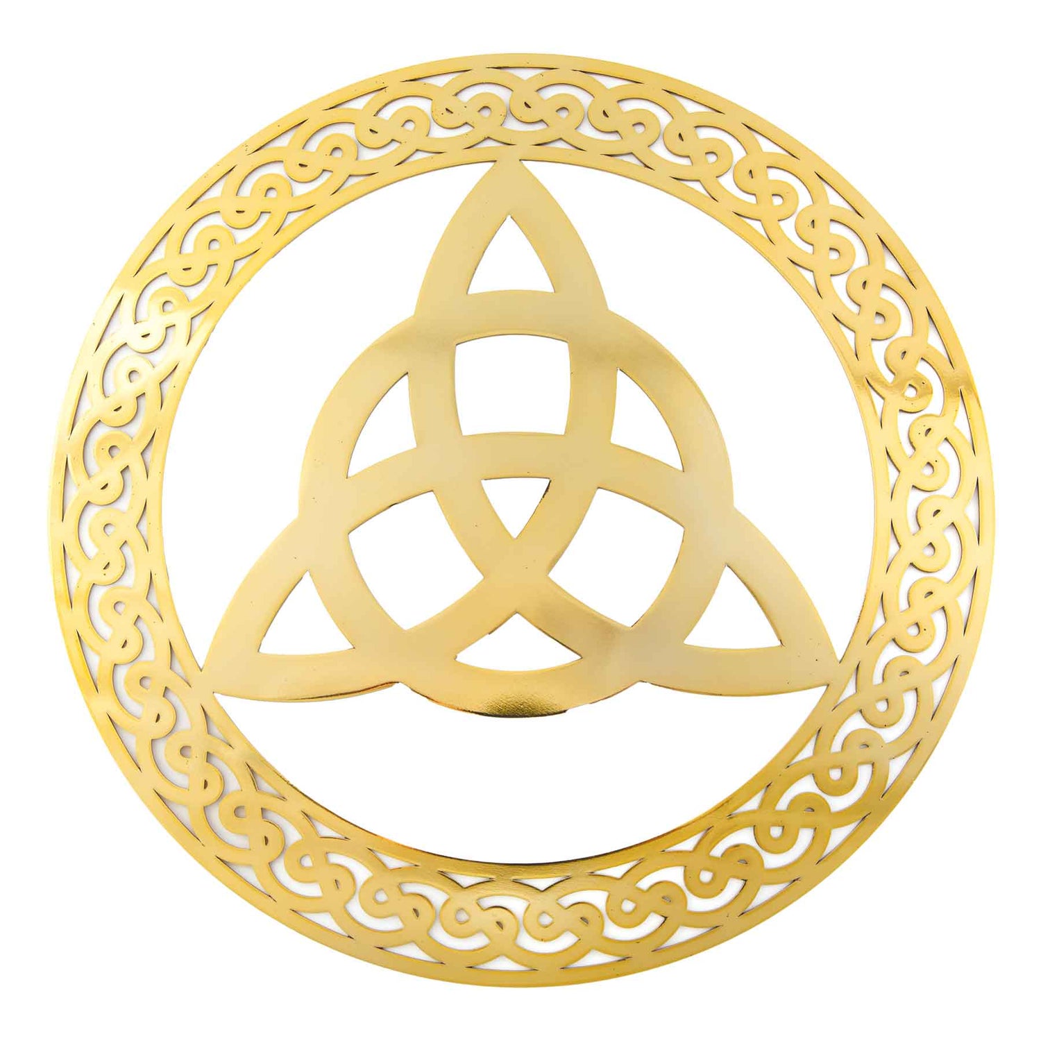 Elevate your home decor with the timeless elegance of our Trinity Knot Wall Hanger in Polished Brass. Expertly crafted from mild steel for lightweight durability and featuring a thickness of 0.06", this piece is finished in polished brass for a touch of vintage charm. The round-shaped hanger showcases an authentic Celtic Trinity Knot design, encircled by a beautiful ring of Celtic knots, symbolizing unity and eternity in ancient Celtic culture. Measuring 12'' in diameter, it's the perfect size to make a statement on any wall. Ideal as a housewarming gift or a meaningful addition to your own home, it comes in a charming presentation box, ready to be admired.