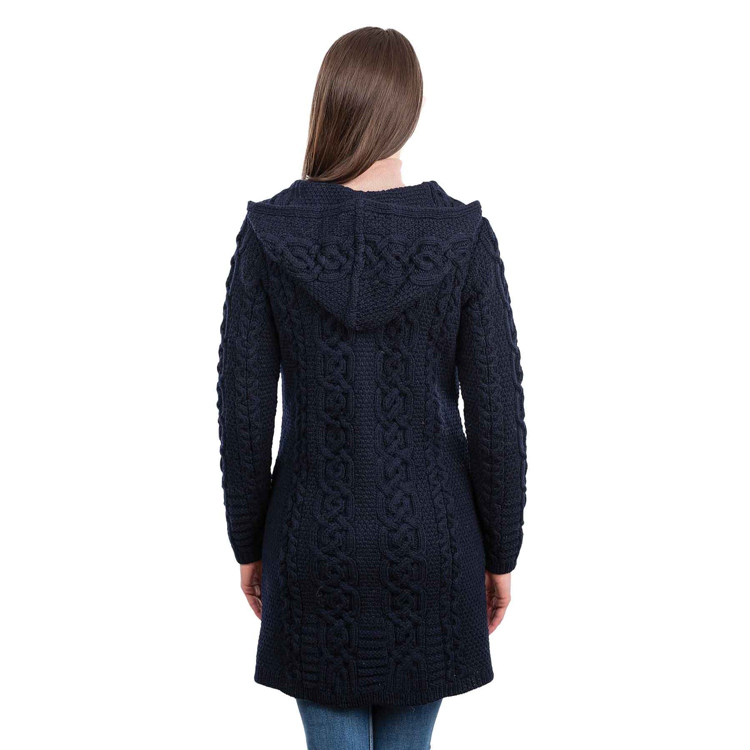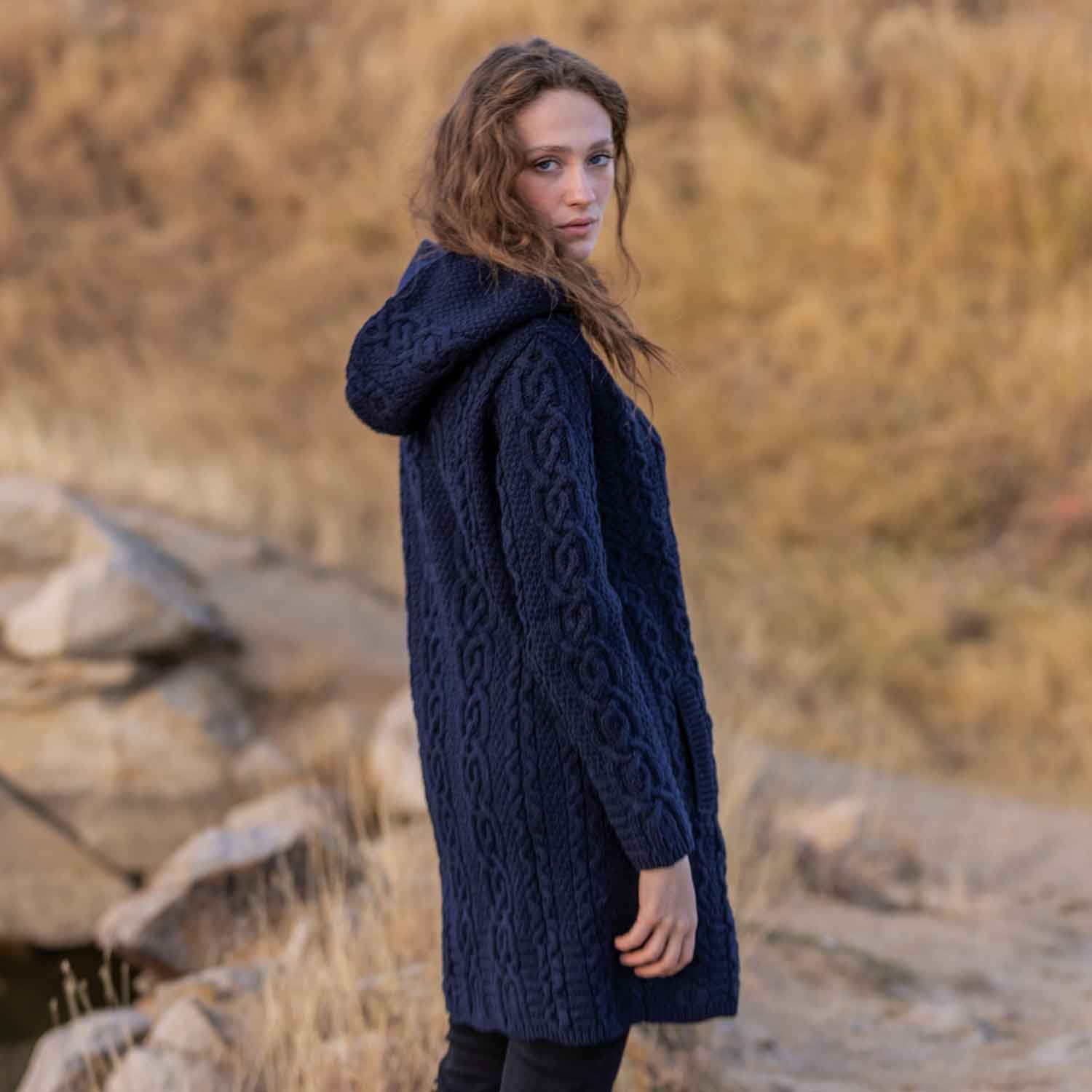 Women's Woollen Aran Knit Hooded Coatigan, Navy